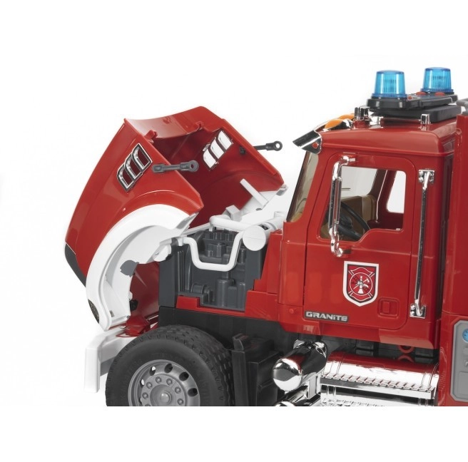 Vivi l’azione come dei veri pompieri. Questo modello finemente dettagliato BRUDER MACK Granite offre una lancia ad acqua completamente funzionante e una scala estendibile fino a 120 cm, che ruota di 360°. Gli stabilizzatori assicurano una base solida durante l’“intervento”, mentre il lampeggiante con sirena (BR2801) completa l’esperienza di gioco autentica.