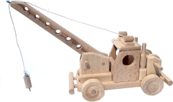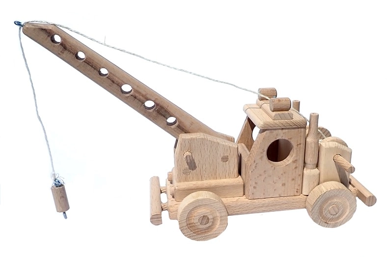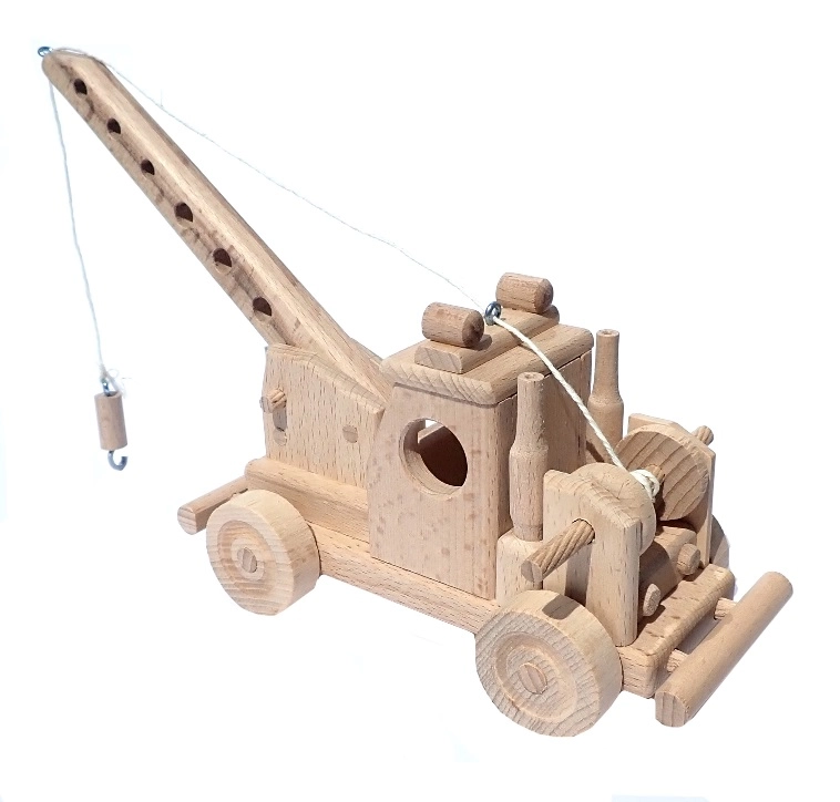 La gru è dotata di un braccio funzionale e di un gancio su cordino per sollevare piccoli oggetti – ideale per sviluppare fantasia e motricità fine.