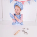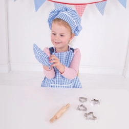 I giovani cuochi ameranno questo luminoso e piacevole set da cucina in cotone blu per cuocere e cucinare. Include un grembiule, un guanto, un cappello da cuoco, un mattarello e formine da forno, ideale per cucinare divertendosi e giocare a fare i grandi.