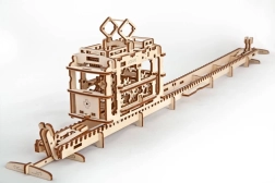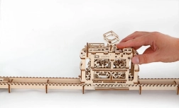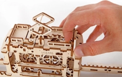 Il modello è dotato di meccanismo a carica per marcia avanti e indietro, quindi la cabina affronta anche la salita. Il pratico vano portaoggetti è nascosto sotto il lucernario di emergenza sul tetto. Il kit è realizzato in impiallacciato di qualità, si assembla senza colla e include istruzioni dettagliate.