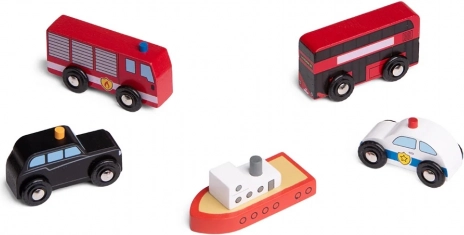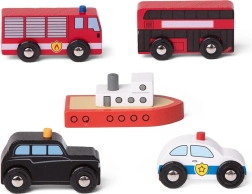 - 5 pezzi nella confezione: camion dei pompieri, auto della polizia, autobus a due piani, taxi, barca.