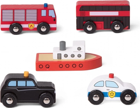 - 5 veicoli in legno: camion dei pompieri, auto della polizia, autobus a due piani, taxi, barca