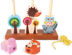 Questo set in legno di qualità unisce impilamento e infilatura in un unico gioco intelligente. I bambini possono disporre riccio, volpe, scoiattolo, procione e gufo sul supporto con tre pioli oppure infilarli sul laccetto incluso. I pezzi sono robusti, adatti alla mano dei più piccoli e, grazie ai colori, stimolano la fantasia.