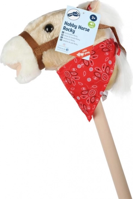 Il cavallo a bastone Rocky è dotato di un pulsante sull'orecchio che, una volta premuto, emette un neccio realistico, aggiungendo autenticità al gioco.