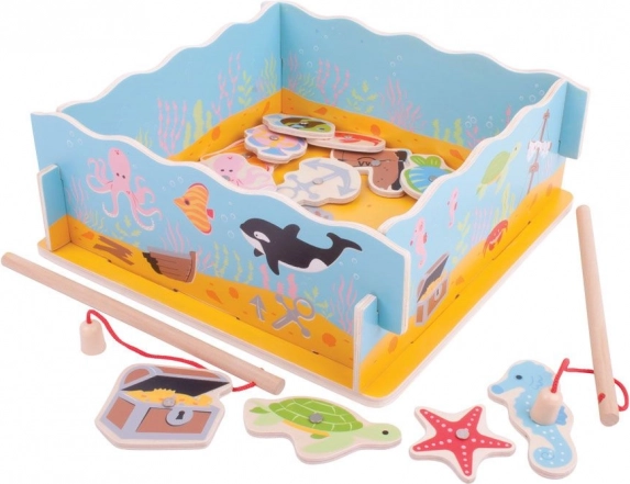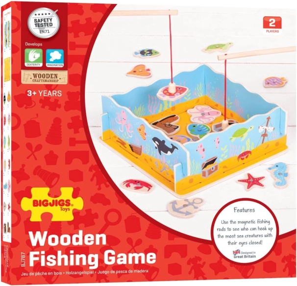 I bambini, con le canne magnetiche, pescano 11 pesciolini e altri pezzi come il forziere del tesoro, la scarpa e l’ancora, allenando la precisione nel riporli nei punti corretti. La lavorazione in legno di qualità e i colori sicuri garantiscono lunga durata e gioco in sicurezza.