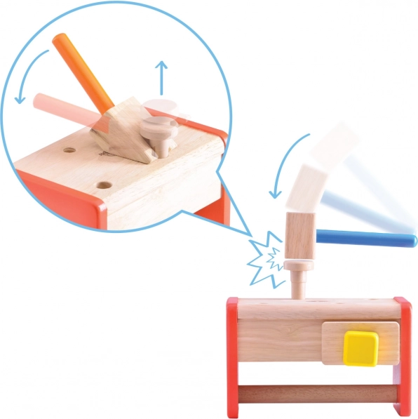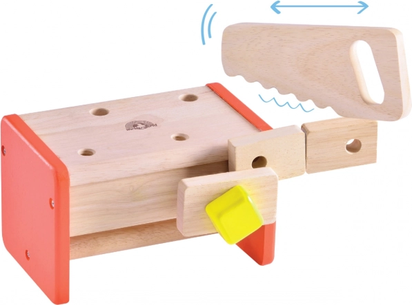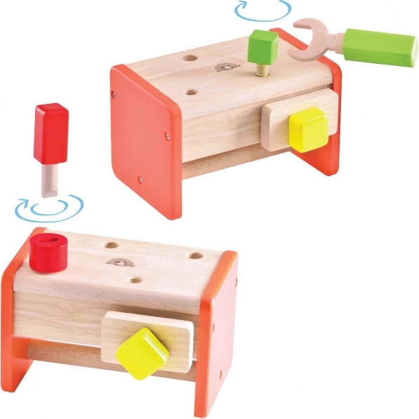 La cassetta si trasforma facilmente in un banco da lavoro con morsa, permettendo ai bambini di giocare e imparare allo stesso tempo.