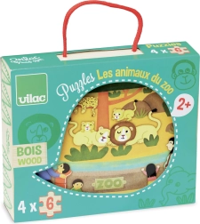 Puzzle in legno con tema Zoo offre divertimento per bambini dai 2 anni. Contiene quattro puzzle, ciascuno di sei pezzi, ed è praticamente riposto in una scatola di legno con manico in cotone.
