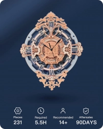Difficoltà media, 231 pezzi e istruzioni chiare. Il montaggio richiede circa 5 ore e il risultato è un orologio decorativo con possibilità di allineare con precisione il quadrante una volta appeso alla parete.