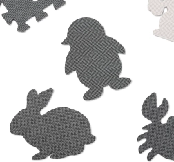 I 9 pezzi da 30 × 30 cm si assemblano in un tappetino da 85 × 85 cm. Le tessere si possono combinare, trasportare e riporre rapidamente nell’apposita sacca pratica.