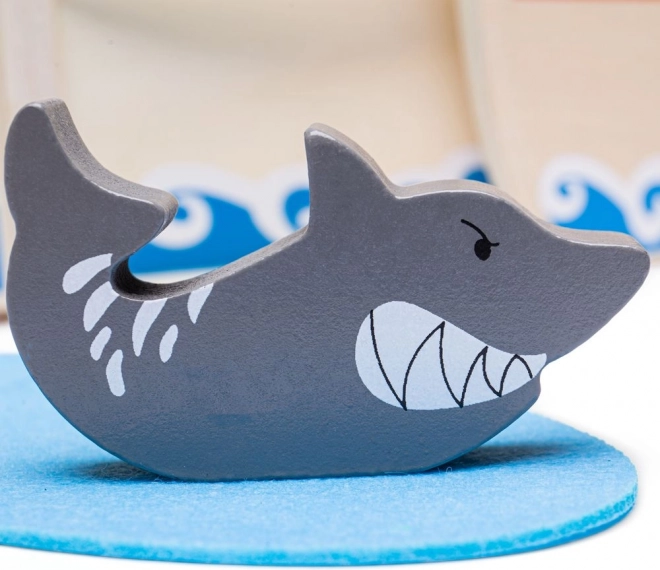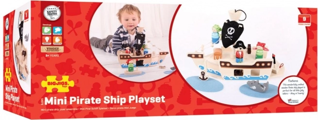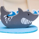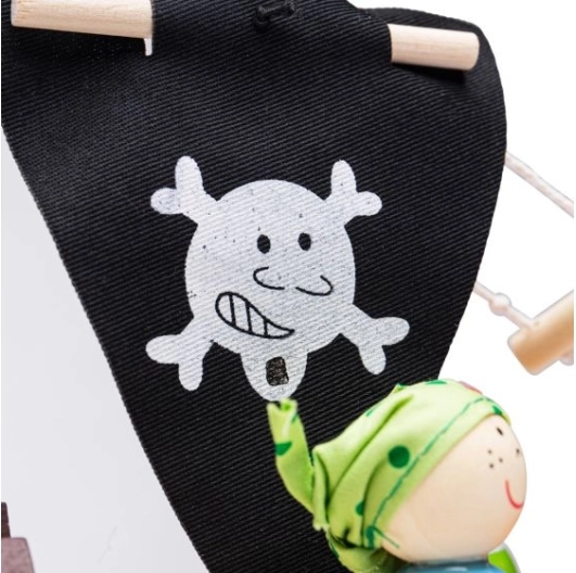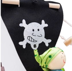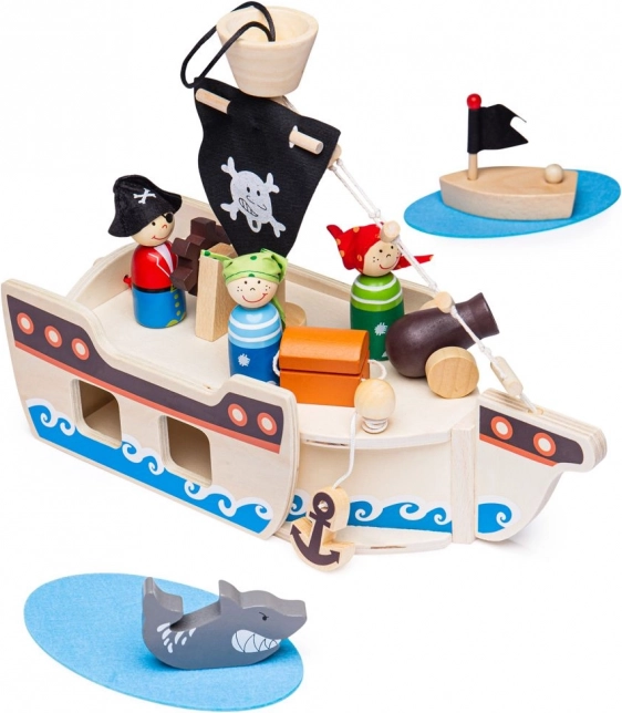 Questo set di nave pirata in legno contiene tutto ciò che i piccoli pirati hanno bisogno per le loro avventure. La confezione comprende un capitano, due pirati, una nave, un'ancora, un baule del tesoro e uno squalo. Tutti gli elementi di gioco possono essere comodamente riposti nella nave, rendendolo ideale per viaggi e facilità di trasporto.