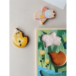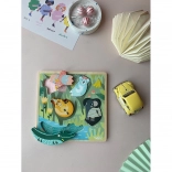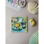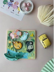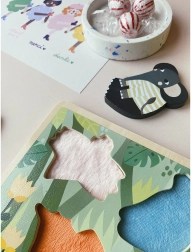 Il design di Michelle Carlslund, in tenui tonalità pastello, dona al gioco un aspetto attraente e stimola la fantasia. La base in legno con incavi e motivi di animali insegna ai bambini a abbinare le forme, riconoscere i colori e gli animali. Il puzzle è resistente, sicuro e realizzato in legno di qualità combinato con tessuto.