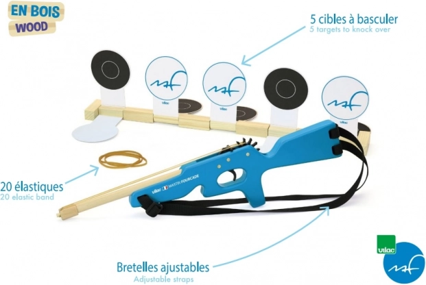 Il fucile in legno è dotato di cinghie regolabili in tessuto, ideali per ogni bambino. La confezione include cinque bersagli pieghevoli e venti elastici per il tiro ripetuto. Prova a impostare i bersagli a diverse distanze e mettiti alla prova con la tua precisione!