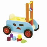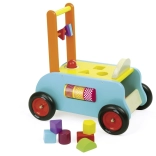 Sui lati si trovano sagome per inserire le forme in legno, sul lato sinistro rulli colorati girevoli e sotto lo schienale triangoli colorati rotanti. La seduta è dotata di un clacson con effetti sonori che diverte e motiva a nuove scoperte. Grazie alla seduta bassa, il carrellino è comodo anche per i più piccoli.