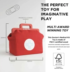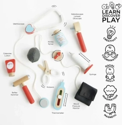 Elegante set da dottore per piccoli medici in una borsa in tessuto con manici in legno, che offre tutto il necessario per il gioco del ambulatorio. Include in totale 10 pezzi, tra cui stetoscopio, termometro e siringa. Il giocattolo è neutro rispetto al genere e favorisce motricità fine, immaginazione e abilità cognitive. Realizzato in legno sostenibile certificato FSC e rifinito a mano con vernici atossiche a base d'acqua.