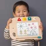 Questa lavagna magnetica da disegno in legno di alta qualità offre ai bambini infinite possibilità creative. Grazie all'ampia superficie con quattro colori vivaci nascono disegni, motivi e forme originali. La matita saldamente fissata con una cordicella non si perde e i quattro timbri magnetici (triangolo, cerchio, quadrato, stella) restano al loro posto grazie alla magnetizzazione.