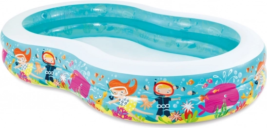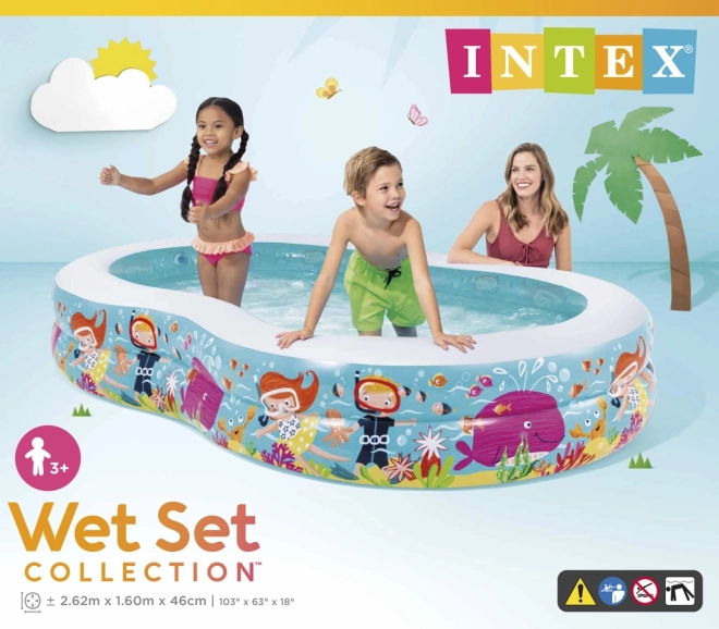 Il contenuto della confezione include una piscina gonfiabile, un kit di riparazione e una confezione colorata.