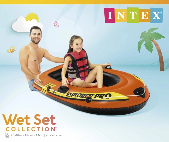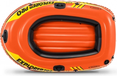 Gommone gonfiabile per una persona delle dimensioni 160 × 94 × 29 cm, dotato di fondo gonfiabile, corda di sicurezza lungo tutto il bordo, supporti per i remi e tre camere d’aria con valvola doppia. Kit di riparazione incluso nella confezione.