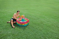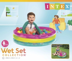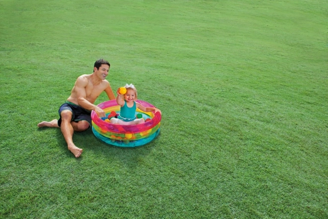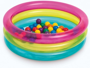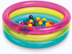 Allegra piscina a secco gonfiabile con palline di INTEX che trasforma ogni cameretta o giardino in un’area gioco sicura. Pareti trasparenti con fascia rosa, gialla e blu. Il resistente PVC garantisce manutenzione facile e lunga durata, ideale per bambini 1–3 anni.