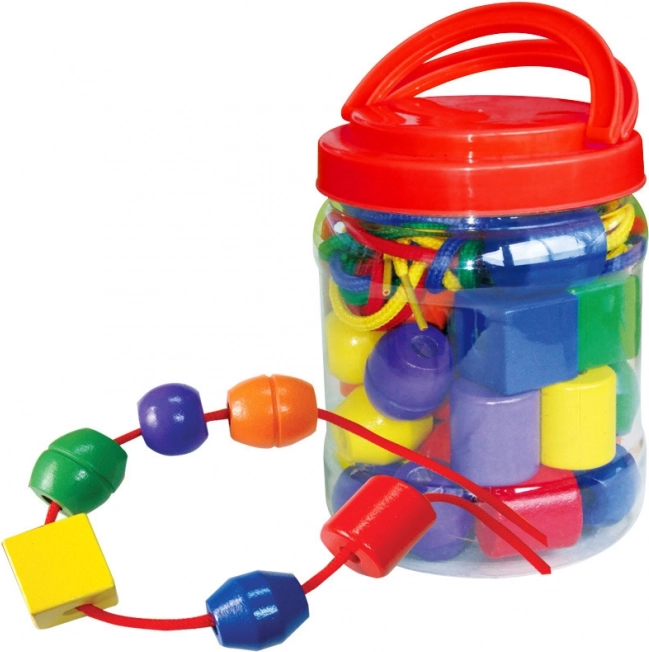 Grandi perline di legno BABU sono eccellenti per lo sviluppo delle capacità motorie fini e per il riconoscimento dei colori. Il set include perline di varie forme, colori e dimensioni, confezionate in un pratico secchiello di plastica.