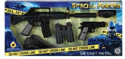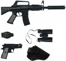 - Pistola in metallo, silenziatore, binocolo, distintivo di polizia, fondina per pistola, mitraglietta di polizia