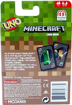 UNO Minecraft unisce la dinamica classica di UNO all’iconico mondo di MINECRAFT. L’obiettivo è scartare tutte le proprie carte il più velocemente possibile, abbinando colori e numeri e usando con astuzia le carte azione. L’edizione Minecraft aggiunge l’esclusiva carta Creeper – appena la peschi e la mostri, gli altri giocatori devono prendere 3 carte.