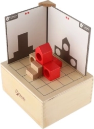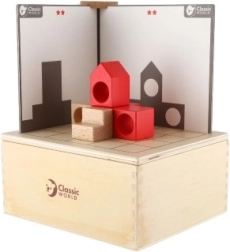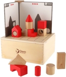 Il set è progettato per bambini dai 3 anni in su e tutti i pezzi sono conservati in sicurezza in una scatola di legno delle dimensioni di 18,5 x 16 x 9 cm. I bambini possono provare a costruire blocchi seguendo le carte e abbinare entrambi i lati, esercitando così logica e abilità.