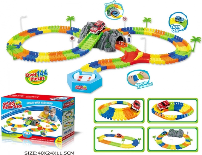 Pista variabile con tunnel composta da 144 pezzi. Il set include una macchinina, un tunnel e altri accessori. Il funzionamento richiede 2 batterie AA da 1,5 V, non incluse nella confezione. Disponibile con macchinina rossa o blu. Questa pista è molto semplice da assemblare.