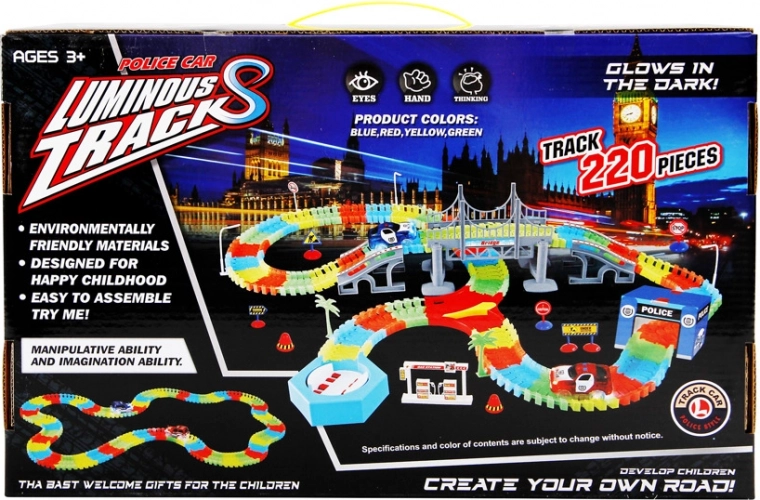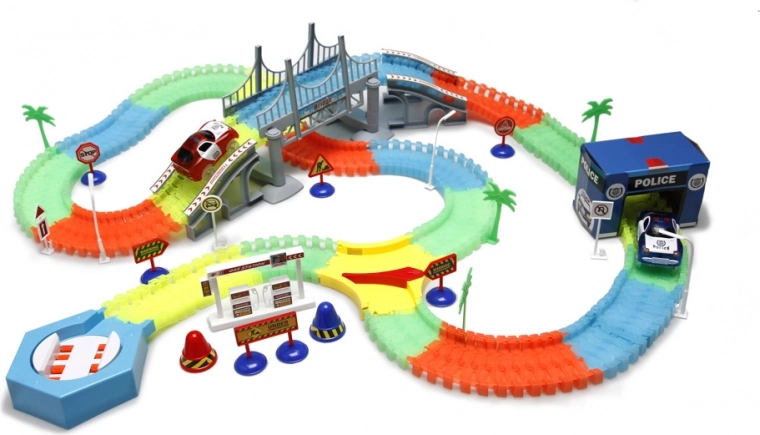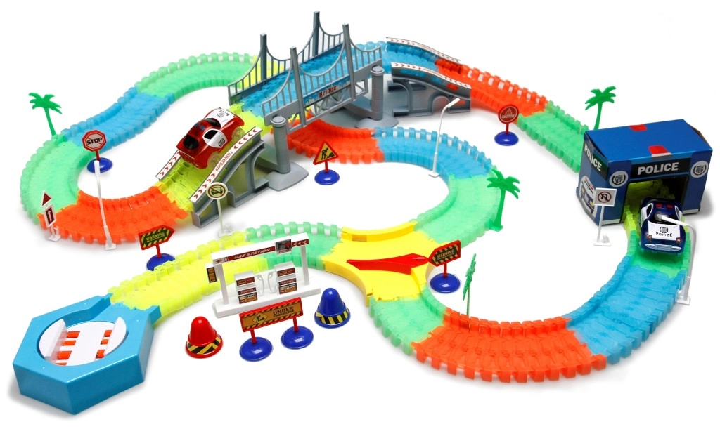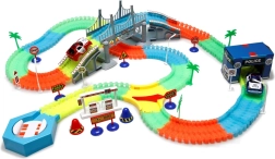 La pista luminosa con 220 elementi flessibili offre costruzioni creative e gare emozionanti anche al buio. I pezzi si incastrano con facilità per creare rettilinei, curve e ponti, consentendo di cambiare il tracciato in pochi istanti.