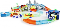 È inclusa una macchinina LED (rossa o blu) che si illumina durante la corsa lasciando un effetto luminoso scenografico. L’ambientazione di gioco è arricchita da stazione di polizia, segnali e stazione di rifornimento, così i bambini possono sviluppare fantasia e gioco narrativo.