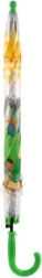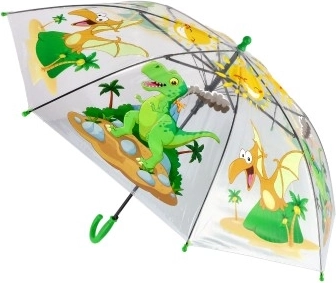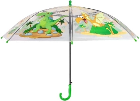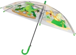 Allegro ombrello per bambini con cupola trasparente e colorate fantasie di dinosauri trasforma le giornate di pioggia in divertimento. Grazie all'apertura automatica, alla struttura leggera e alla comoda impugnatura verde è facile da usare e si adatta perfettamente alla mano dei più piccoli.
