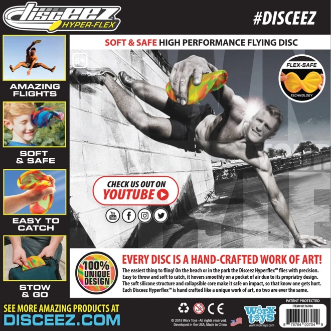 Il frisbee DISCEEZ Hyper-Flex con diametro di 20,5 cm è progettato per il massimo divertimento e sicurezza. È realizzato in materiale morbido e flessibile che garantisce un volo stabile e una presa confortevole senza impatti dolorosi. Grazie ai motivi e colori accattivanti, conquisterà subito bambini e adulti.
