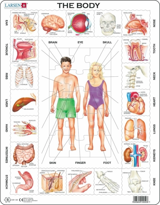 Scopri il corpo umano in modo giocoso con il puzzle del marchio Larsen! Una volta composto, otterrai un’immagine chiara con i principali sistemi di organi e le parti del corpo. 35 pezzi robusti, forme uniche e cartone di qualità garantiscono una lunga durata. Il puzzle sviluppa il pensiero logico, l’immaginazione spaziale e la pazienza – ideale per bambini dai 4 anni, a casa, all’asilo e a scuola.