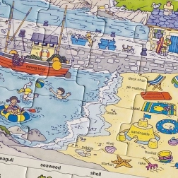 Scopri tutto ciò che si può trovare sulla spiaggia e impara a nominare gli sport acquatici tramite questo divertente puzzle. Ogni pezzo rappresenta una parola diversa da abbinare all'immagine corretta sul bordo del puzzle. Il puzzle contiene 18 pezzi al centro che formano una scena completa con vocaboli educativi in inglese. I bambini possono cercare le parole nell'immagine per una migliore comprensione.
