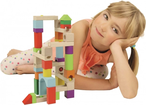 Questa pista delle biglie in legno offre percorsi diversi per le biglie, incoraggiando la creatività e lo sviluppo delle abilità motorie.