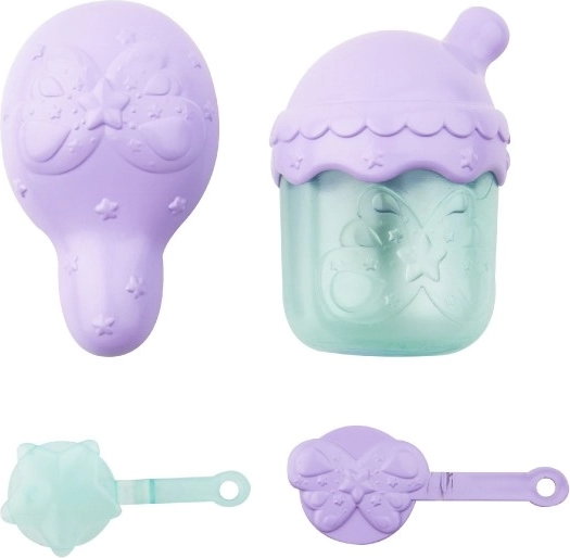 Nella confezione trovi biberon, pettinino, ali, mollettine, adesivi, ciondolo e certificato di adozione: tutto per una trasformazione perfetta.