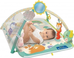 Sono inclusi giochini sospesi removibili, uno specchietto per il riconoscimento di sé, un sonaglino-nuvoletta che imita il suono della pioggia, tre anelli-mordicchiatoi e un modulo elettronico con melodie e suoni della natura. Il tappetino è lavabile a 30 °C, le parti in plastica si puliscono con un panno umido. Uno spazio di gioco sicuro che favorisce coordinazione dei movimenti, percezione spaziale e immaginazione.