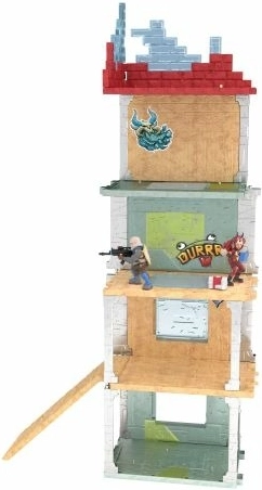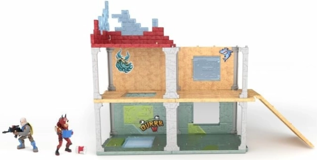 Questo set di gioco riproduce esattamente le strutture di gioco di Fortnite, inclusa la torre con tetto rosso e pannelli in legno.