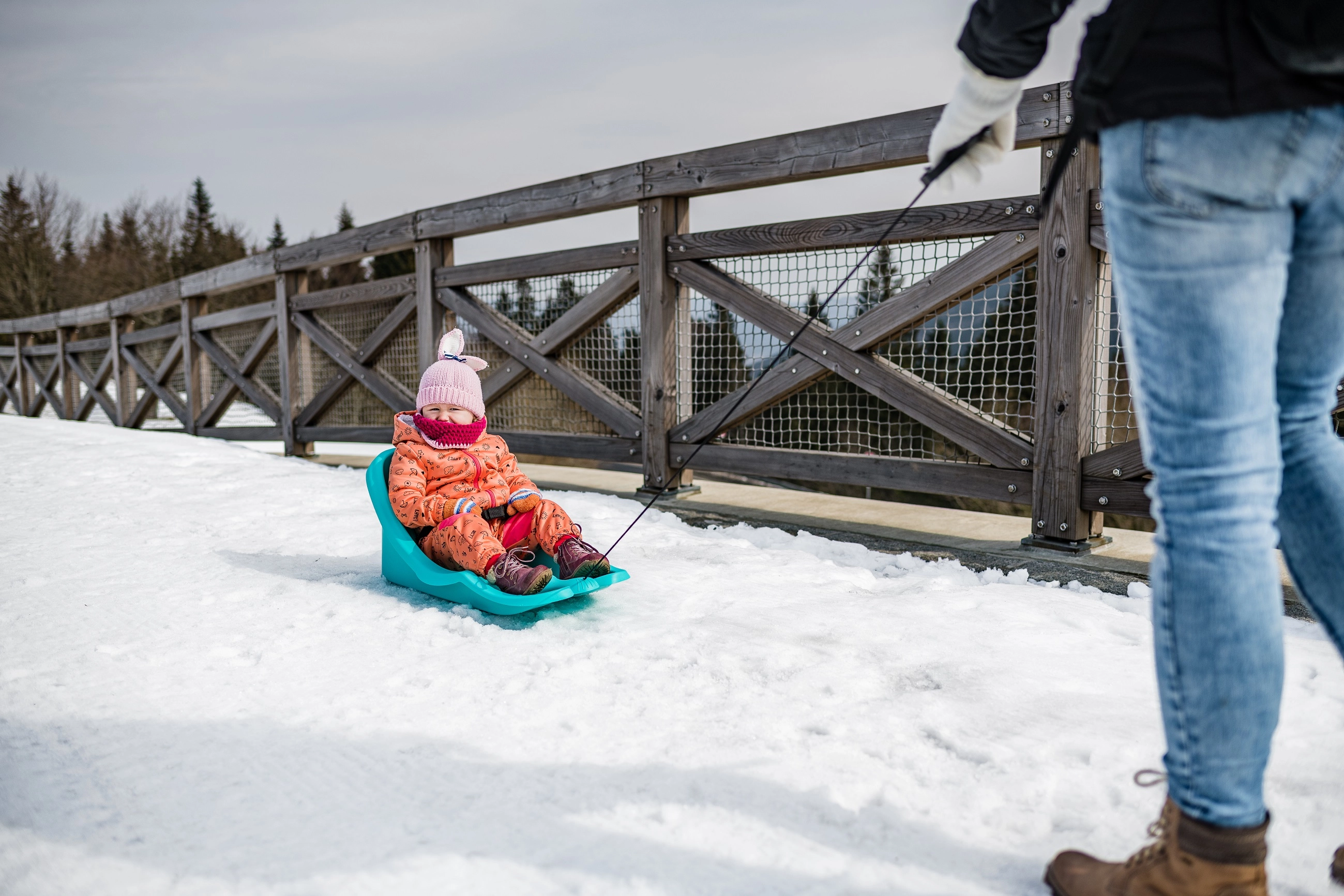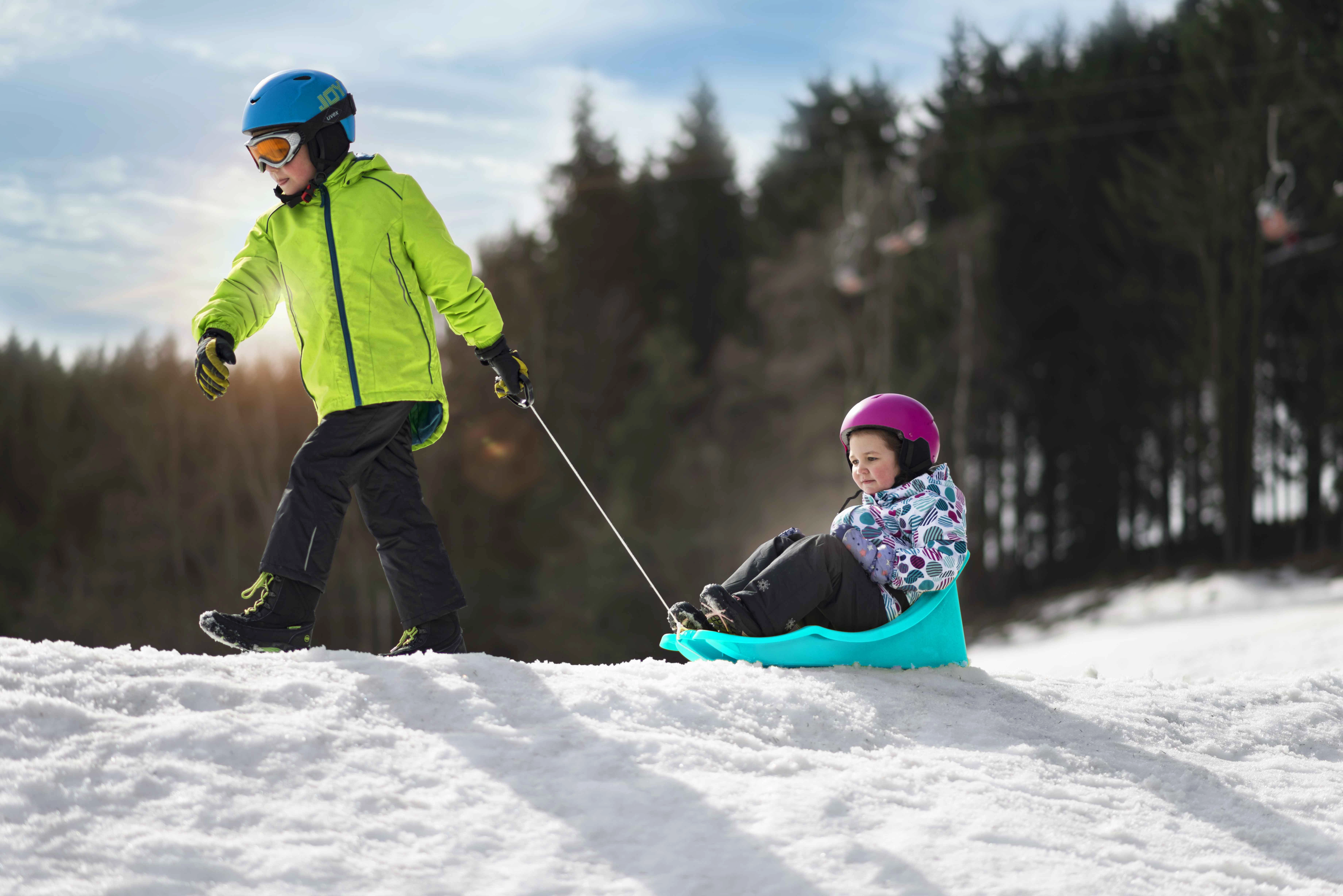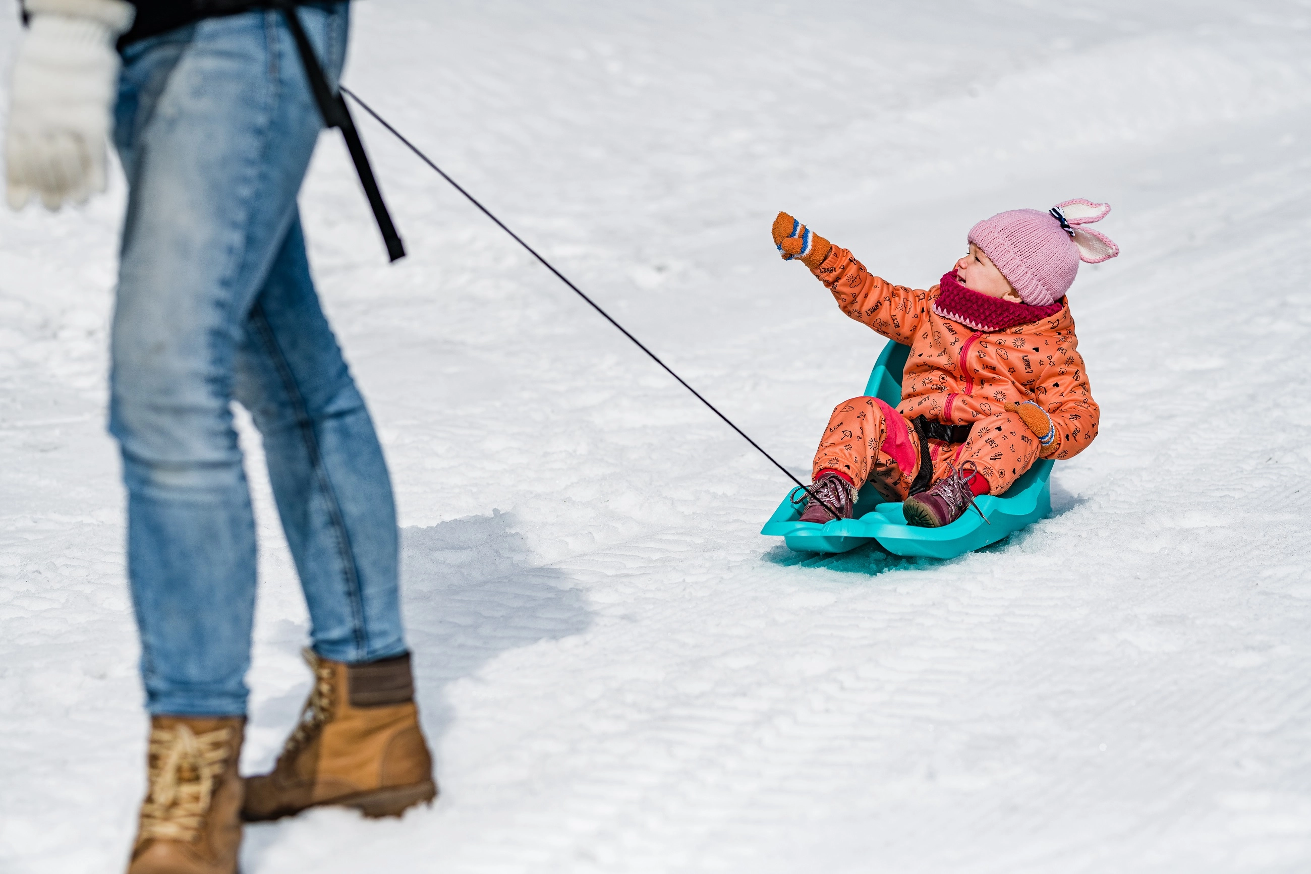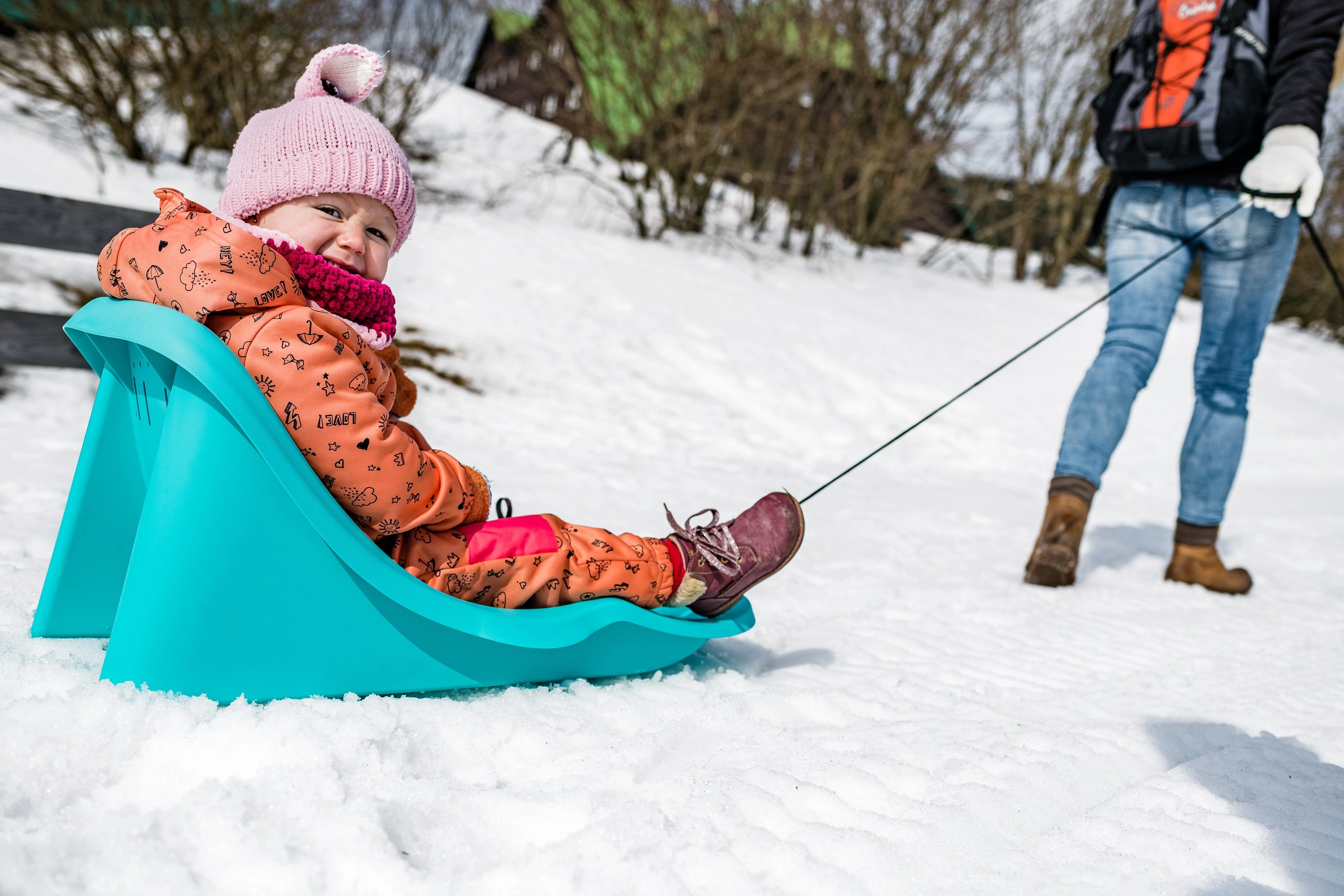 La pratica fune di traino con maniglia consente ai genitori di trascinare facilmente lo slittino sulla neve anche per tragitti più lunghi.