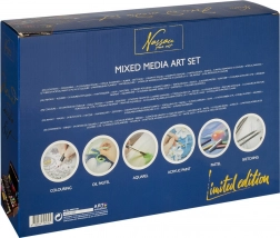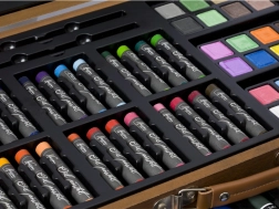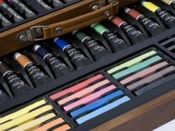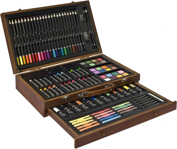 Set per pittori in valigetta di legno – la valigetta di legno pieghevole contiene tutto il necessario per il pittore: gessetti colorati, pastelli, colori, temperino, gomma, pennelli, ecc. In totale 112 pezzi.