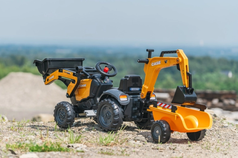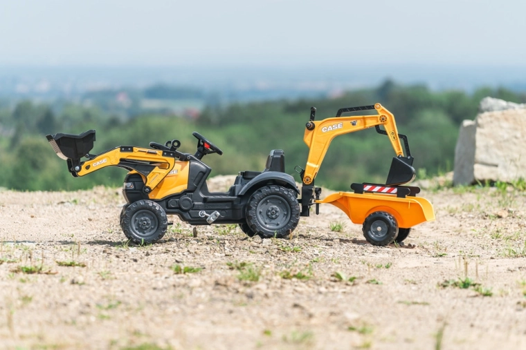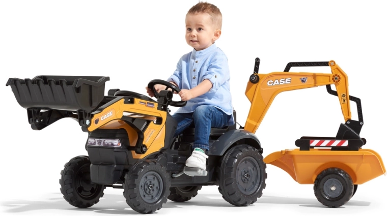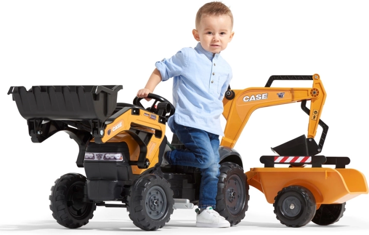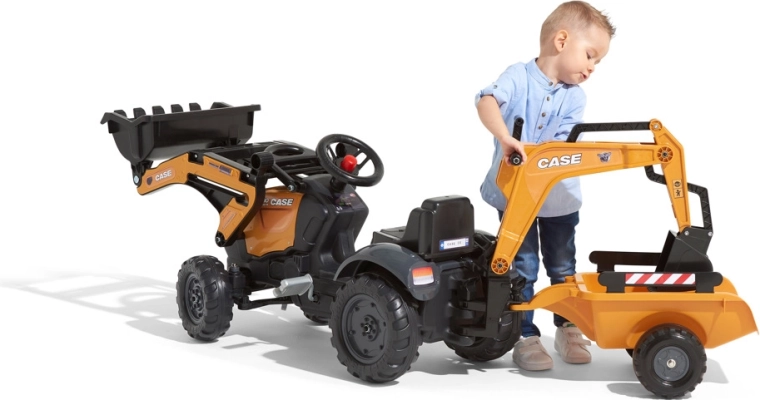 Trattore a pedali Case Construction 580 Super N arancione con benna anteriore e posteriore funzionante e rimorchio a due ruote, sedile girevole, cofano apribile e clacson. Realizzato in plastica di alta qualità e ad alta resistenza. Dimensioni 180×45×53 cm. Età 2+. Tutti i trattori Falk sono testati fino a 50 kg secondo i requisiti delle norme europee. Prodotto in Francia.