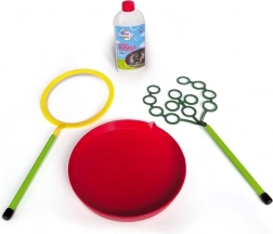 Nella confezione trovi due cerchi – uno per bolle giganti e uno per tante piccole bollicine –, una ciotola rossa per un’immersione comoda e una ricarica da 0,5 l. Ideale per pomeriggi in famiglia, feste e giochi all’aperto.
