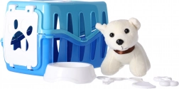 Cagnolino in scatola di trasporto blu. Il set di gioco include un cagnolino di peluche, una scatola, una ciotola, delle forbici e un ossicino. Soddisfa le norme UE più severe. Prodotto con materiale sicuro per la salute.