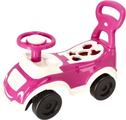 Il multifunzionale spingicarro 4in1 di Pilsan combina guida, girello, push-along e gioco educativo con inserimento forme. Offre clacson meccanico, schienale removibile, vano portaoggetti sotto il sedile e materiali sicuri e atossici per un gioco divertente e in sicurezza.