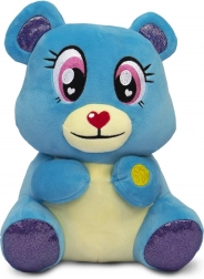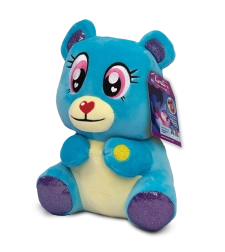 L'orsetto ha grandi occhi ricamati e un naso a forma di cuore, le sue orecchie e zampe sono di materiale scintillante viola.