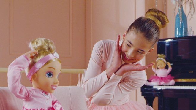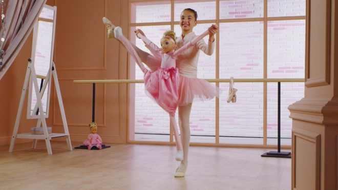 Il giocattolo incoraggia i bambini ad allenarsi nel balletto grazie alla possibilità di interagire con la figurina nello studio di danza. La bambina nell’immagine e Ballerina Molly dimostrano posizioni di balletto reali.