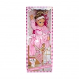 Ballerina Molly indossa un incantevole abito rosa con una fascia coordinata e i capelli raccolti in uno chignon. Il suo viso è finemente dettagliato, con grandi occhi che ne esaltano l’aspetto elegante.