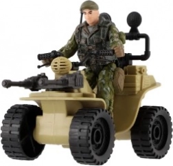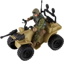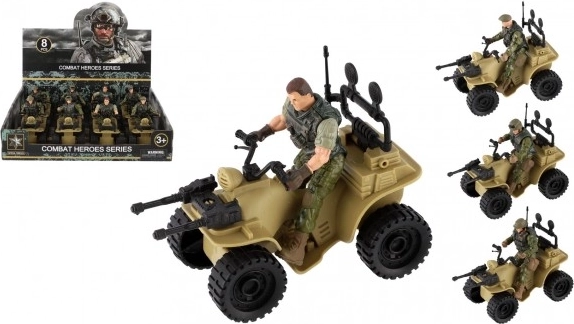 Questo quad offre dettagli realistici, inclusi l'uniforme mimetica del soldato e i grandi pneumatici neri.