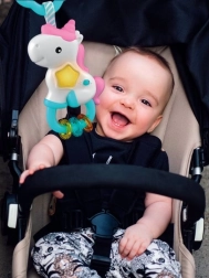 L’adorabile unicorno di Baby Clementoni è il compagno ideale a casa e in viaggio. Combina melodie, effetti luminosi ed elementi tattili sicuri che stimolano naturalmente la curiosità del bebè e sviluppano i suoi sensi. Grazie alle dimensioni compatte si porta ovunque e si fissa facilmente nel punto in cui il bambino lo raggiunge meglio.