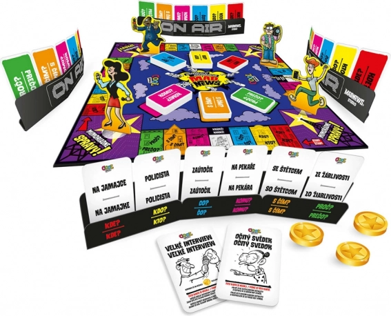 - Tavola di gioco, 6 set di carte ATTUALITÀ, 6 pedine reporter, 1 tavola di gioco, 1 clessidra (30 secondi), 6 studi giornalistici, guida