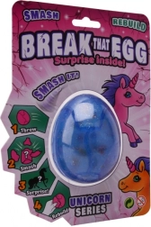 Presenta un uovo blu della Serie Unicorn, che i bambini possono lanciare e rompere per scoprire la sorpresa all'interno.